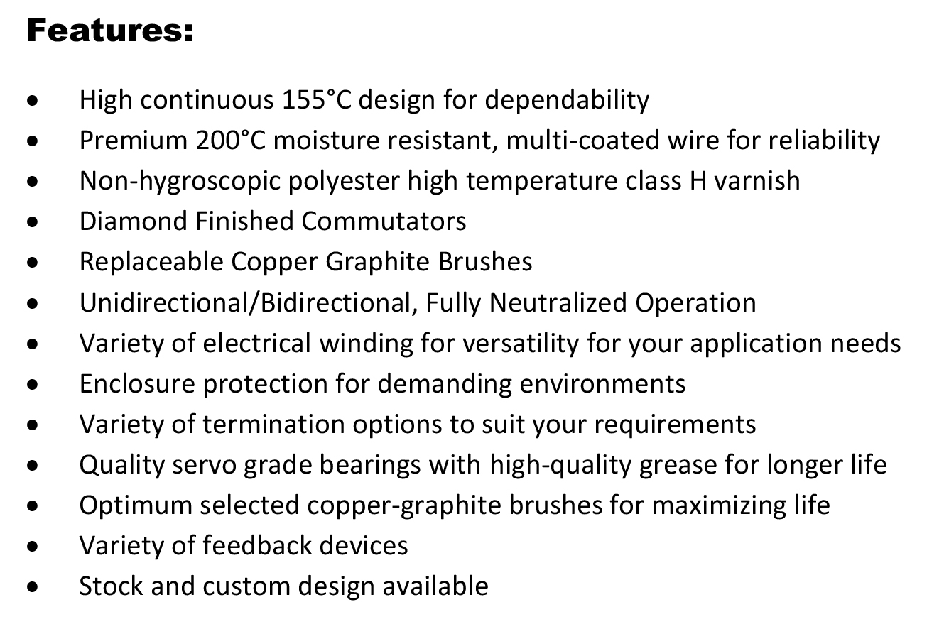 Intact supplies DC high performance servo motors designed rugged to meet demanding requirements of industrial motion control. They can be supplied with many electrical and mechanical options so the design fits your application. Some of the many options available include: tachometers, encoders, brakes, mountings, shafts, windings, speeds, connectors, environmental. The DC servo motors provide a wide range of continuous stall torques. They are designed to provide reliability and dependability and long life in today's tough applications.